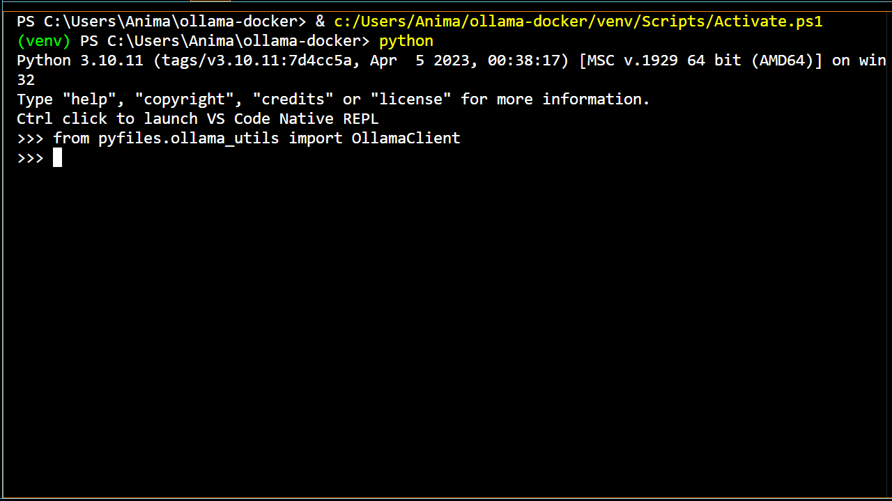 Again, all logs will be printed in the console and stored in ./ollama-docker.log. The name of the Python script doesn't matter as long as you use the same name in step 2 and step 3.
