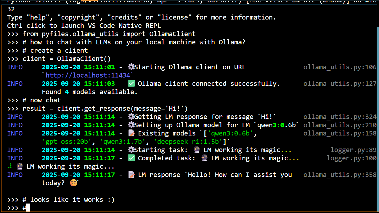 That's it ! We've gone through all the code in this repo that's needed to understand how to setup an Ollama server in Docker and use it to chat with LMs in a local Python environment .