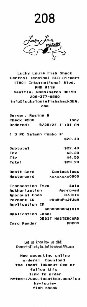 { 'total': 29.28, 'subtotal': 22.49, 'customer': 'Tony', 'server': 'Rosina R', 'purchased_items': [{'name': '1 3 PC Salmon Combo #1', 'quantity': 1, 'price': 22.49}] }