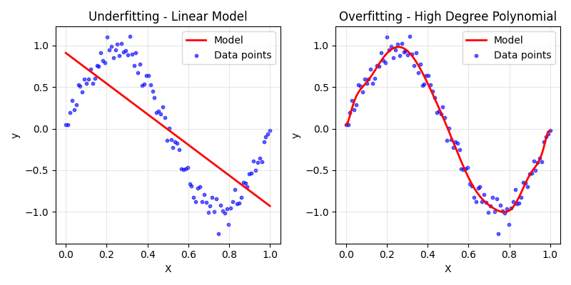 The model on the left clearly underfits the data. It wouldn't be able to predict many of the points very well and would need a large bias to explain variations in the data, while the model on the right is going through most of the points and curving in all the right places to fit this particular dataset. This model would typically have a small bias and would perform poorly on the test set.