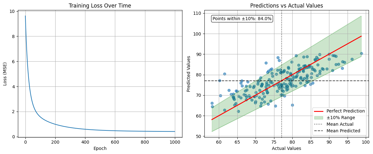 The plot on the right shows the predicted and actual values along with \(10\%\) ranges and the mean lines, just like previously. However, this time more of the data points fall within the \(10\%\) range while our predicted mean is still a bit off compared to the actual mean. We could still improve this model!