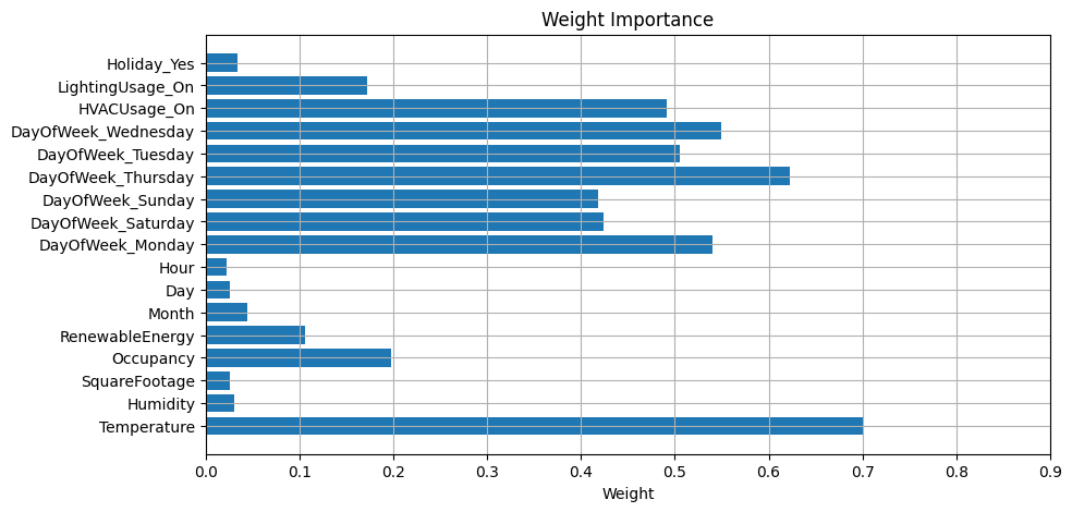 y = 0.7004 * Temperature + -0.0306 * Humidity + -0.0260 * SquareFootage + 0.1974 * Occupancy + 0.1056 * RenewableEnergy + 0.0439 * Month + 0.0253 * Day + -0.0218 * Hour + 0.5400 * DayOfWeek_Monday + 0.4241 * DayOfWeek_Saturday + 0.4177 * DayOfWeek_Sunday + 0.6228 * DayOfWeek_Thursday + 0.5051 * DayOfWeek_Tuesday + 0.5500 * DayOfWeek_Wednesday + 0.4917 * HVACUsage_On + 0.1723 * LightingUsage_On + 0.0337 * Holiday_Yes + -0.7687