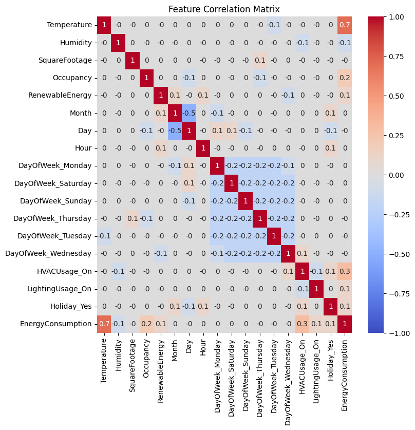 This means that as month increases from 1 to 2, the total number of days decreases (because we only have half of month 2 recorded). This correlation is an artifact of how our data is presented and shows us that we should think more deeply about how to engineer the features we feed to our model, especially when given a small amount of biased data. We could potentially take into account the cyclical nature of the months in a year, but with only one and a half months recorded it seems that perhaps this feature won't be the most helpful for predicting energy consumption.