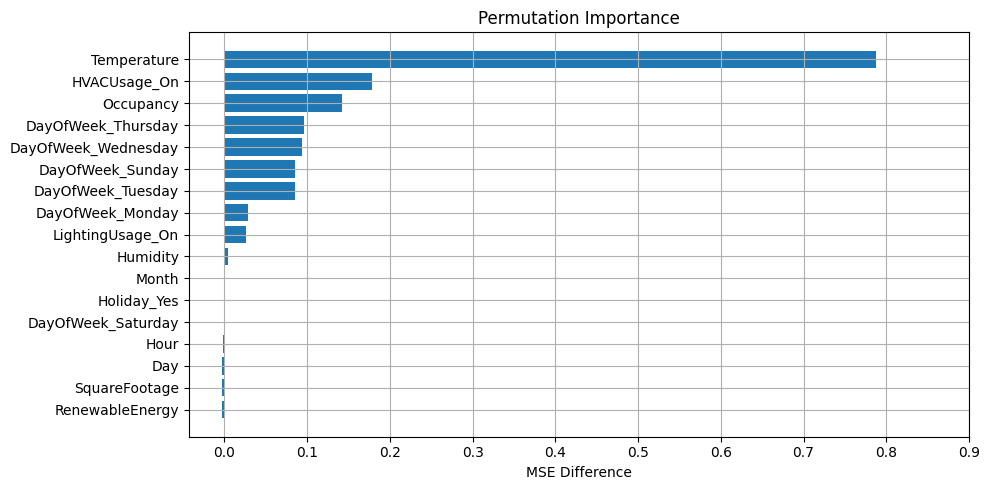Just like in the previous tutorial, the temperature contributes the most. But, this time the HVACUsage feature is in a close second. These two features do make the most sense in terms of what will contribute the most to energy consumed. We also see that many of the different days of the week are more or less on the same level, many of them are contributing more or less the same. This suggests that taking each day of the week (minus one) as a feature is a poor choice. Also, the month doesn't seem to contribute much, but intuitively it seems that it should as more extreme temperatures in the summers and winters typically result in more energy consumed. Perhaps this isn't the best way to represent this feature.