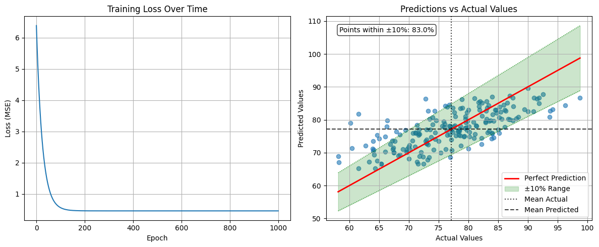 We can see that our loss quickly converged to some value close to around \(200\) epochs, while our predicted values don't quite line up with many of the actual values. The red, solid line here shows where the predicted and actual values coincide. The green filled region shows where the predicted values are off by \(10\%\) from the actual values, while the dotted and dashed black lines show the averages of the actual and predicted values. We seem to have quite a large scatter around the perfect prediction line, with many of the points falling outside the \(10\%\) range. Finally, our predicted mean is a bit off compared to the actual mean. I think our model could benefit greatly from some improvements!