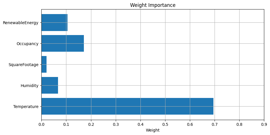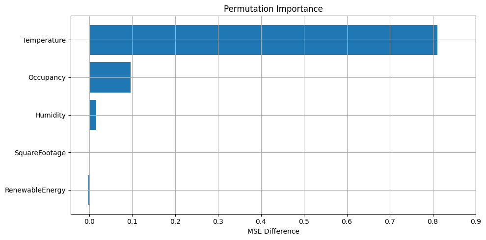 We can see that the Humidity, RenewableEnergy , and SquareFootage features tend to have a small effect on predictions, as shuffling their values doesn't change the MSE that much. The temperature has a huge effect on predictions, while the occupancy has a mild effect. To make our model simpler, we can potentially drop the features that seem to have little effect (i.e. little weight and permutation importance with small correlation coefficients across the board). However, we still have quite a number of features that we left out. Perhaps some of the features that show little importance or correlation will change once we look at the entire feature set.